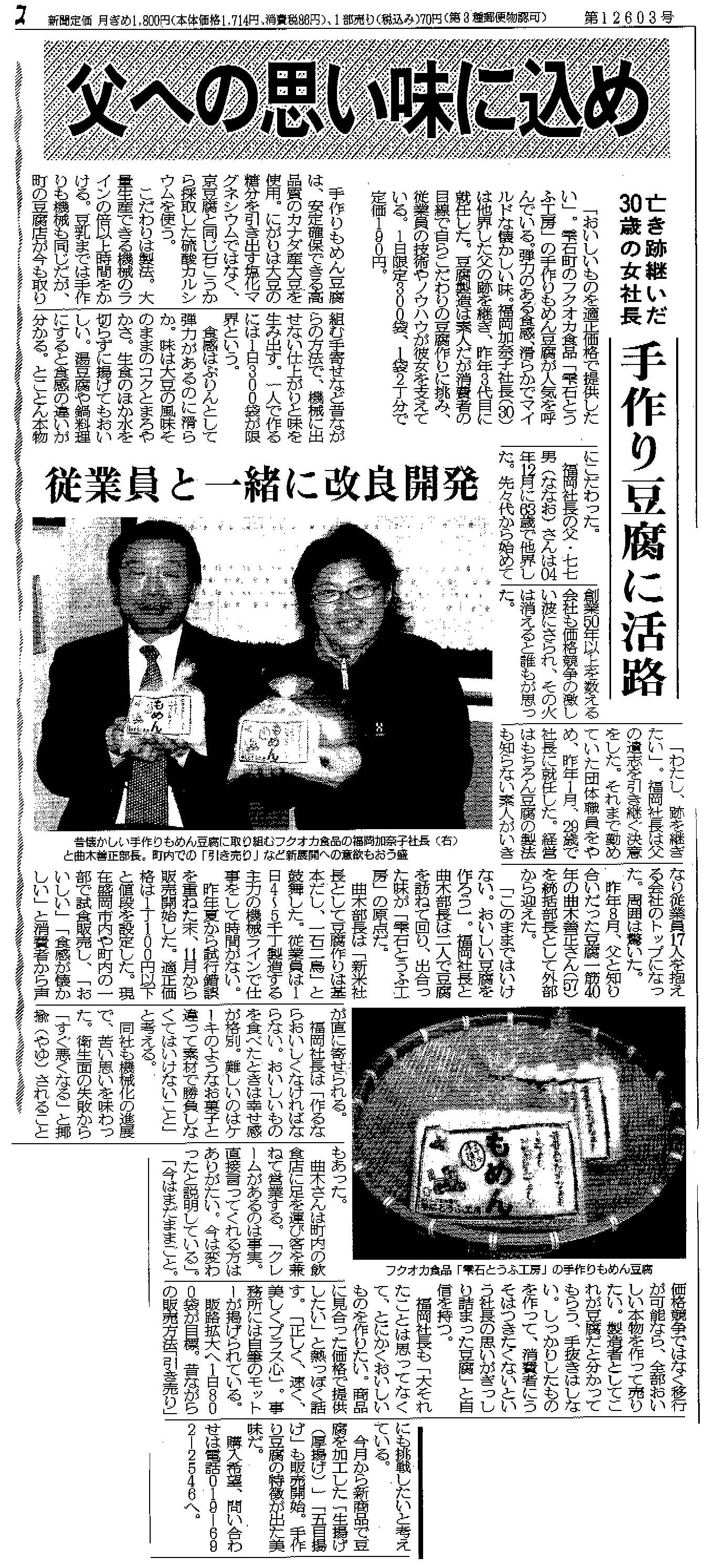 | このお豆腐のできた由来が20060327の「盛岡タイムス」に掲載されてました。昨年の販売開始から一緒に販売をしていて本当嬉しくて・・・・・、今回掲載となったこの記事を掲載しておきます。若社長ほんと一所懸命、心をこめて真面目につくっているんです。岩手の人は豆腐好き。「たかが豆腐されど豆腐」。ほんとう味や触感がちがいます。(昔の豆腐は旨かった〜とお感じの方に・・・・)この一袋約800gですので、通常のお豆腐の約二丁分。鍋よし、奴よし、これからの時期の田楽によし ! ! ぜひお試しを!!(ホームページ作成者) |